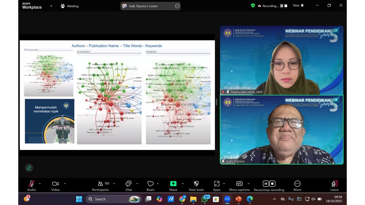 Program Studi S3 Ilmu Pendidikan Sekolah Pascasarjana UNY menyelenggarakan Webinar Series #5 pada Sabtu, 18 Oktober 2025 dengan tema “Optimalisasi AI dalam Penyusunan Artikel Ilmiah Nasional dan Internasional: From Idea to Publish.” Kegiatan ini dibuka oleh Prof. Dr. Siswantoyo, M.Kes., AIFO dan mencatat 276 pendaftar dari dosen, peneliti, pengelola jurnal, serta mahasiswa berbagai perguruan tinggi.